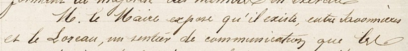 M. le Maire expose qu’il existe, entre Savonnières et le Loreau, un sentier de communication, que les propriétaires des terrains qu’il traverse prétendent supprimer comme n’ayant existé jusqu’alors que par pure tolérance et souffrance. L’un d’eux a même cité devant le tribunal de simple police de Maintenon, une personne qui en a récemment usé comme d’habitude. Il invite le Conseil à prendre une décision à cet égard.